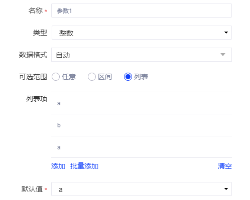 这些选项的可用性由数据类型确定。例如,字符串参数只能接受列表,若选择“列表”,则必须指定值列表。在列表中可输入值。