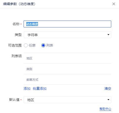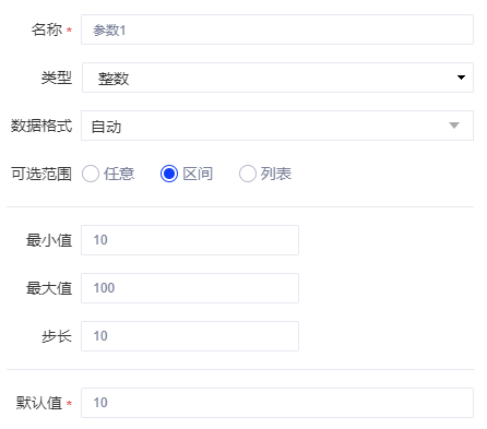 (2)在新建参数的面板,输入参数名称,选择参数的类型、数据格式和可选范围,设置默认值;指定参数接受值的方式,可从以下选项中选择: