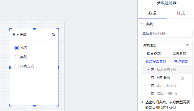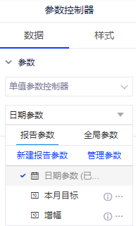 (2)在参数控制器的数据面板中,默认选择“单值参数控制器”,这里会列出当前报告中您所创建的所有参数,可以进行选择;
