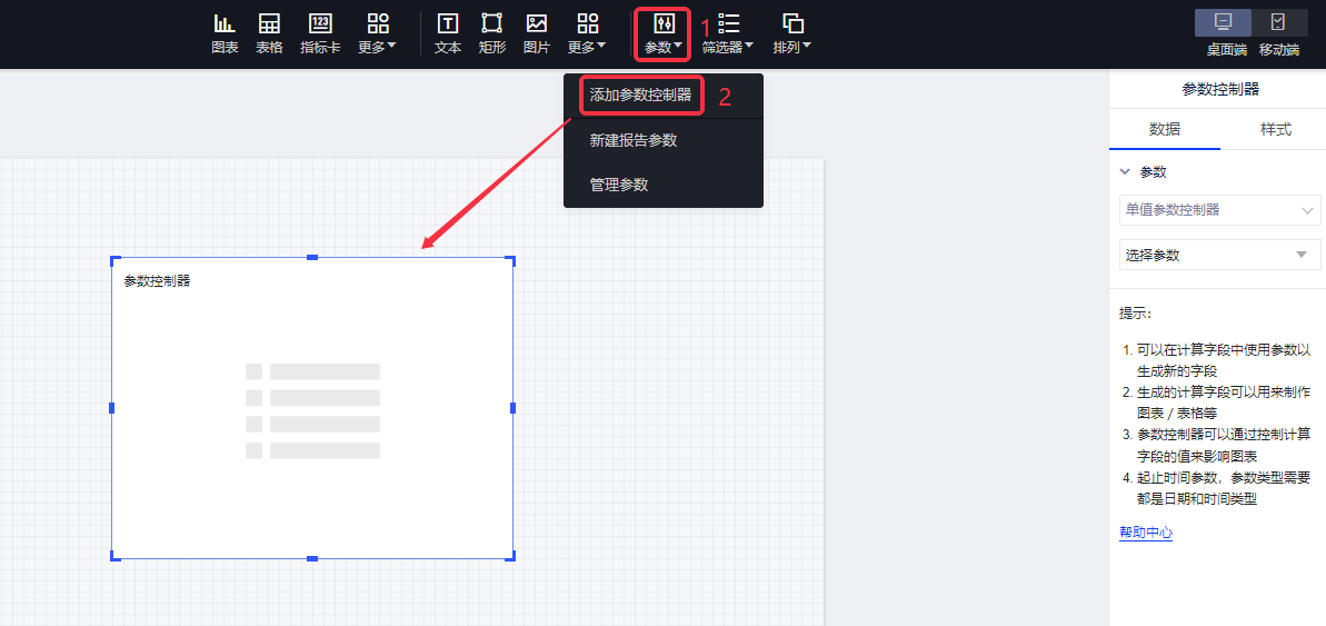 (1)在顶部工具栏中选择添加一个参数控制器;