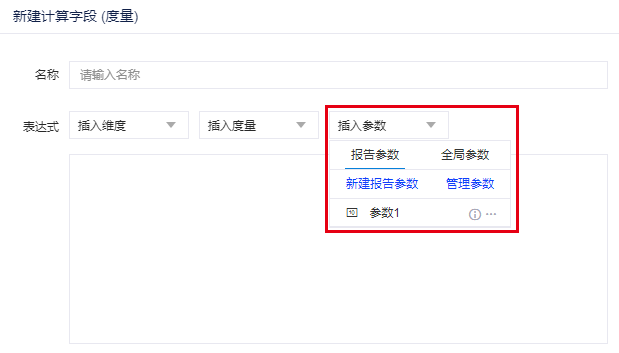 - 计算字段插入报告参数时,参数名默认为“[报告参数].[参数名]”。插入全局参数时,参数名默认为“[全局参数].[参数名]”。通过此策略区分同名的报告参数、全局参数;