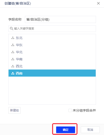 常用场景: 把字段“省/自治区”中字段值划分为“华东”、“东北”等,生成新的组字段“地区”,然后再用“地区”作为维度去分析。