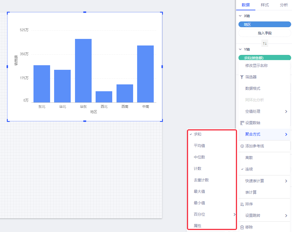 1. 概述2. 快速入门1. 概述聚合的含义是若干行按照一定的标准变成一行,汇总到更高类别的行级别数据。聚合方式包括「求和,平均值,中位数,计数,去重计数,最大值,最小值,百分位,属性」,以满足用户不同的需求。度量默认的聚合方式是“求和”。 2. 快速入门以下图为例,鼠标移动到y轴的“销售额”,Hover点击下拉菜单,选择“聚合方式”,在弹出菜单中可以发现默认的聚合方式为“求和”,您可以直接选择其他聚合方式。 下图展示了针对“销售额”度量,不同聚合方式之间的对比。