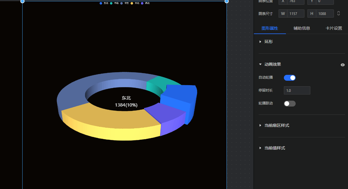 - 动画效果:设置3D环图是否开启动画,以及自动轮播、停留时长、轮播联动。