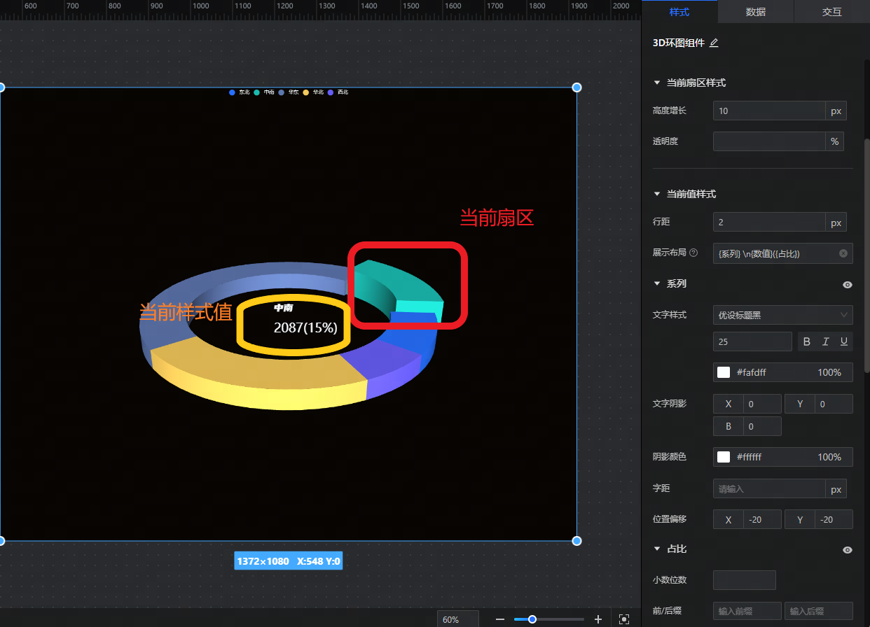 在编辑状态下点击3D环图组件即可对其进行配置,配置内容分为样式、数据和交互三个Tab。(本节仅介绍3D环图特有属性的配置,基础图表共性的配置请参考下文"组件配置")