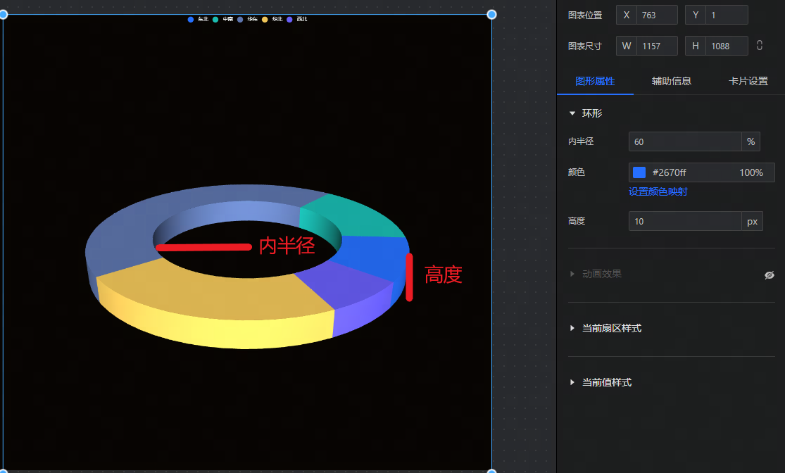 - 维度:设置3D环图的维度字段,如下图所示为“地区”。