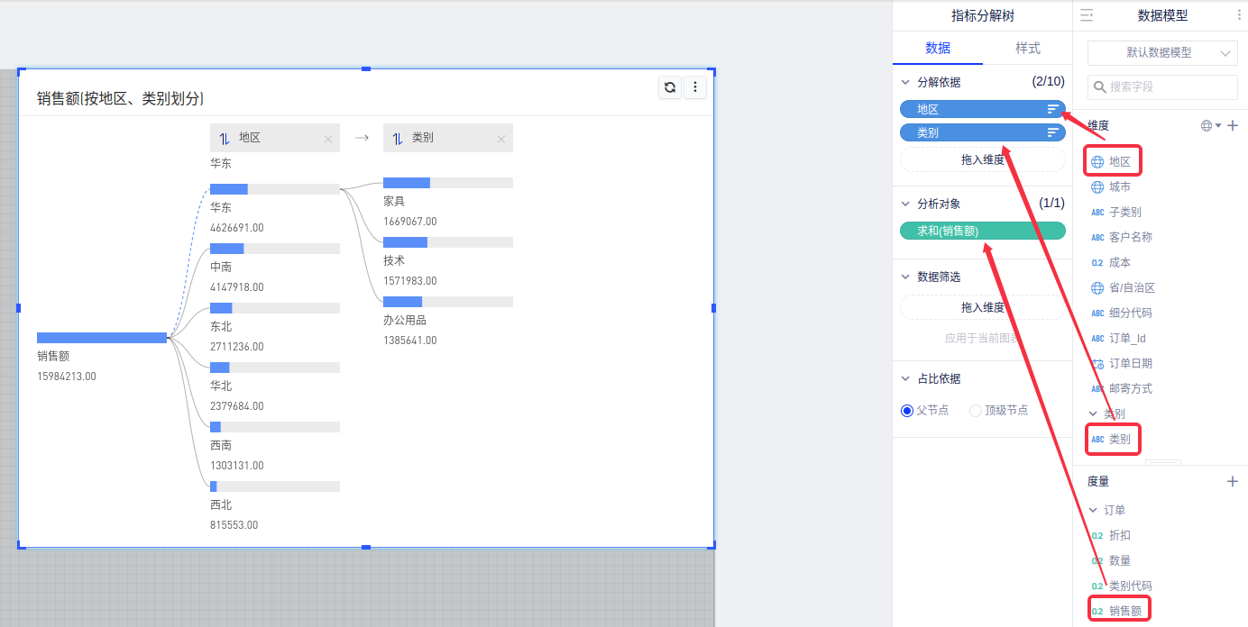 (2)将维度“地区”、“类别”拖入分解依据(分解依据只能是维度字段,最多拖入10个),将度量“销售额”拖入分析对象,得到一个初步的指标分解树;