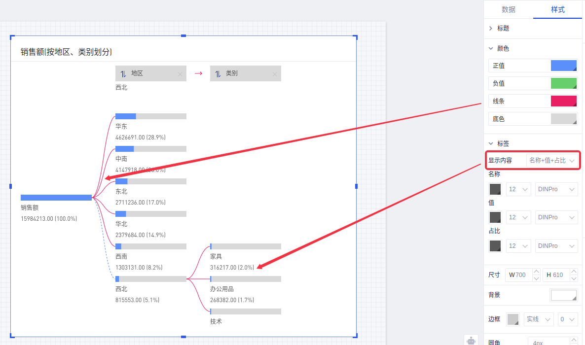 使用场景:多用于将一个值分解至多个组,判断多个组之间的占比情况。以默认数据源为例,拆分各地区和产品类别的销售额情况。