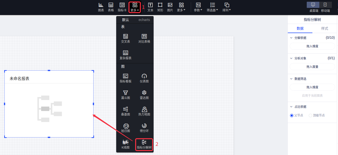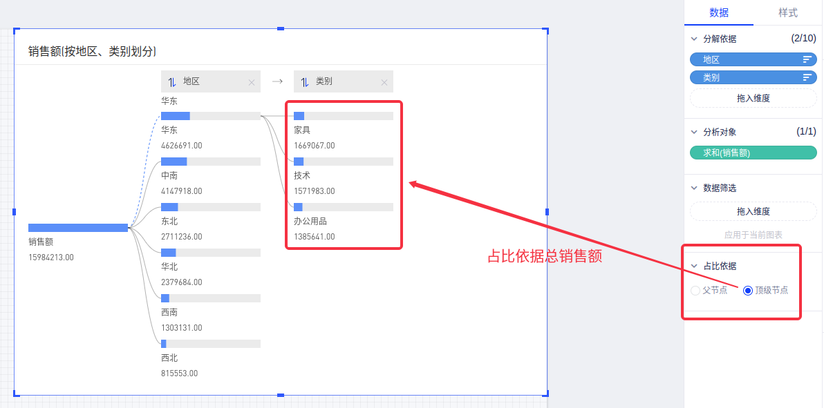 (3)在右侧数据面板占比依据模块,可以按父节点、顶级节点选择,默认父节点;