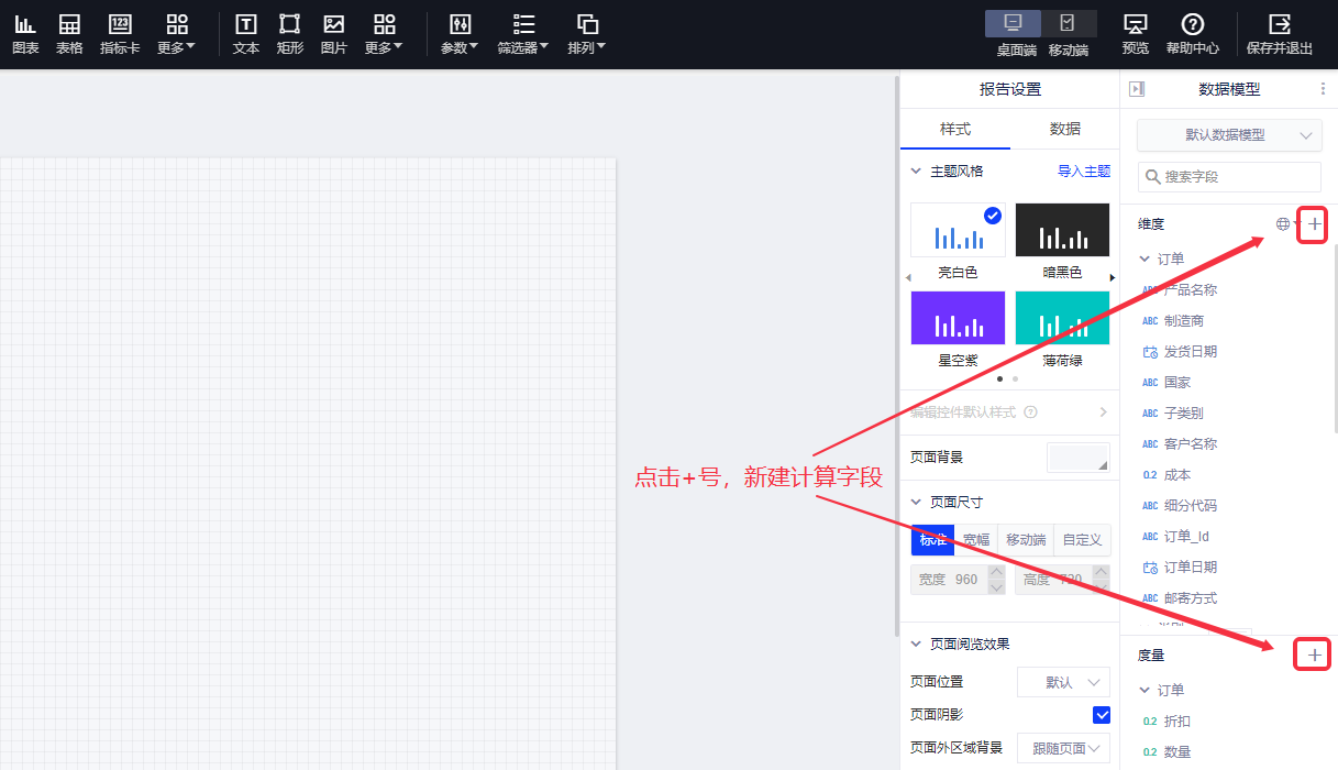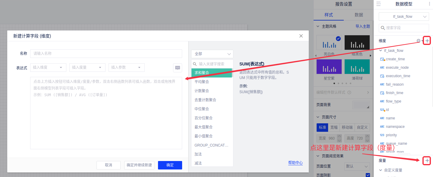 (1)报告编辑页面,点击字段列表区中维度或度量右侧加号,可新建计算字段;
