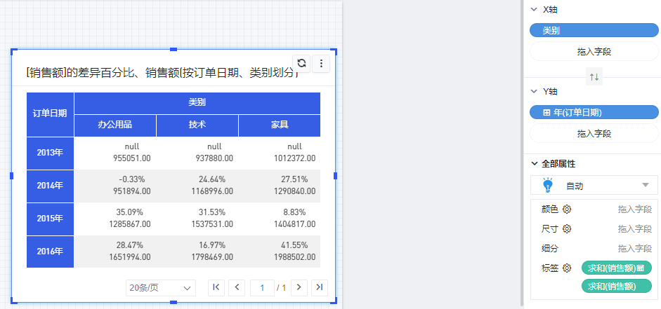 差异百分比只能出现在数字型的度量上,以默认数据模型生成的表格为例,计算各产品类别“销售额”的差异百分比。