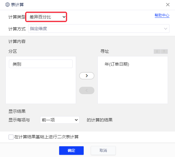 差异百分比是表计算的一种类型,计算同一个度量值在不同维度项上的差异百分比。支持以选定区域第一个/最后一个或计算单位前一个或后一个为基准作差值计算,支持横向或纵向对比计算。
