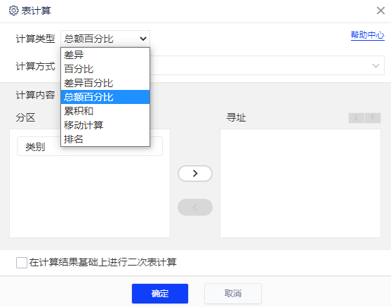 (2)打开表计算面板后,计算类型选择第四项“总额百分比”;
