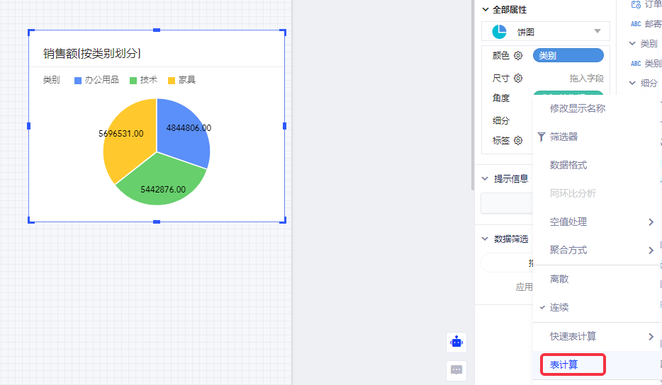 (1)首先把要计算的“销售额”拖拽到配置面板上,并点击小三角(或右键)呼出菜单找到表计算菜单选项;