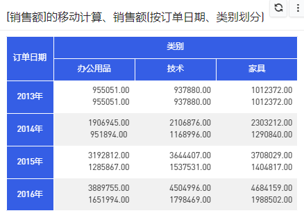 - 根据类别划分了三个小组分别作累积和计算,在每个分组中沿着年(订单日期)中的2013-2016按顺序计算与其前面两项的值求和。