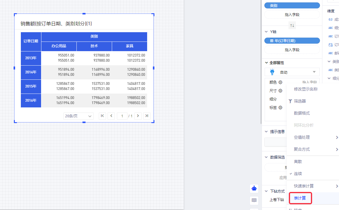 (1)首先把要计算的“销售额”拖拽到配置面板上,并点击小三角(或右键)呼出菜单找到表计算菜单选项;