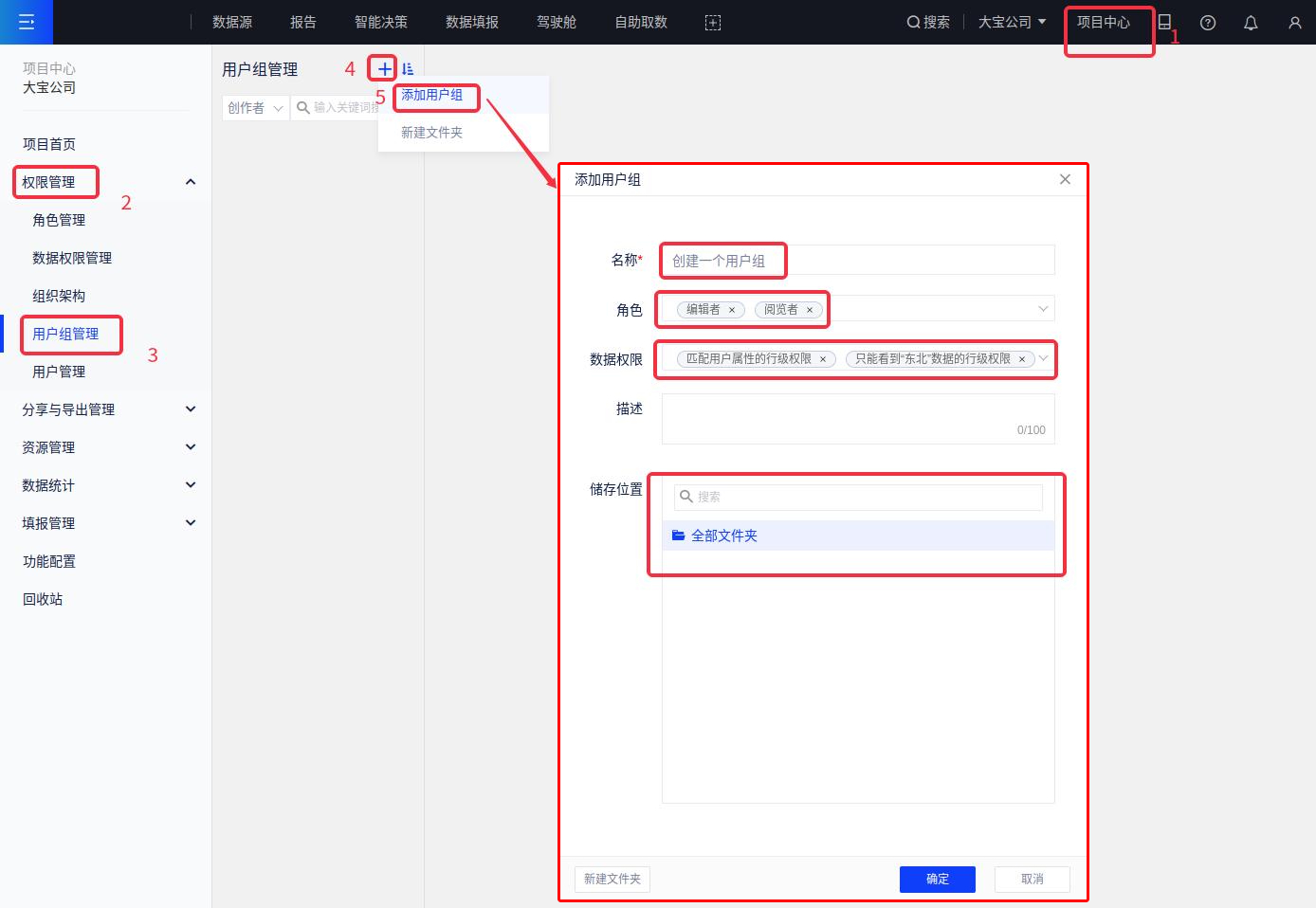 (3)二级管理员添加用户组操作流程与项目管理员一致,但只能看到自己创建的用户组,角色/数据行级权限只能选择自己拥有的角色/数据行级权限。
