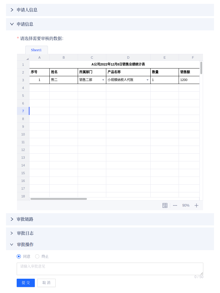 在某一条数据后,点击[去审批]按钮,进入审批数据页面,可对该数据进行“同意”或“终止”的操作。