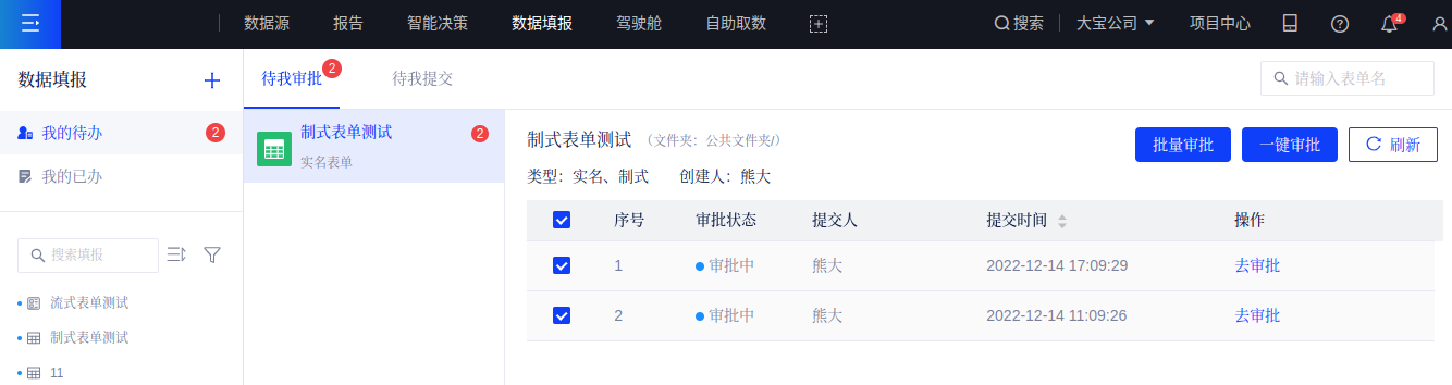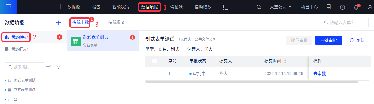 填报者提交的数据需要通过审批者审批后方可写入最终的数据库。在数据填报模块,依次点击[我的待办-待我审批]后,可以看到需要自己进行审批的表单列表,可对未审批的数据进行审批操作。