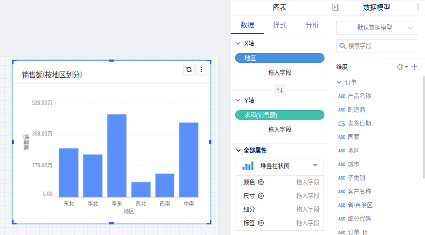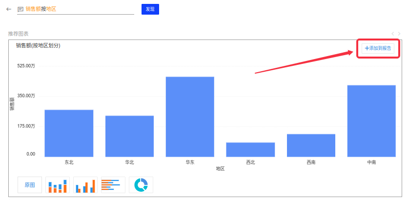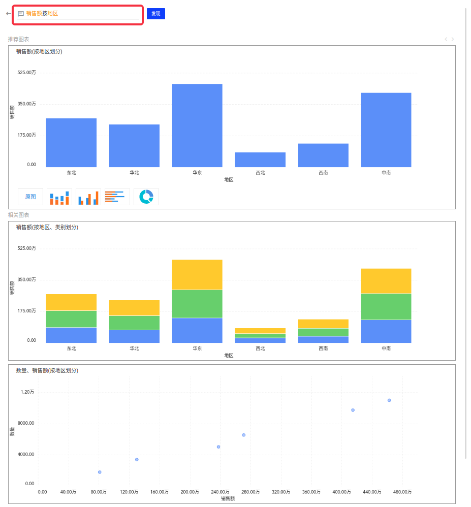 (2)当您输入自然语言提交后,系统会对自然语言进行解析,在该面板的图表展示区自动生成图表。比如输入销售额按地区 得到了以下图表推荐: