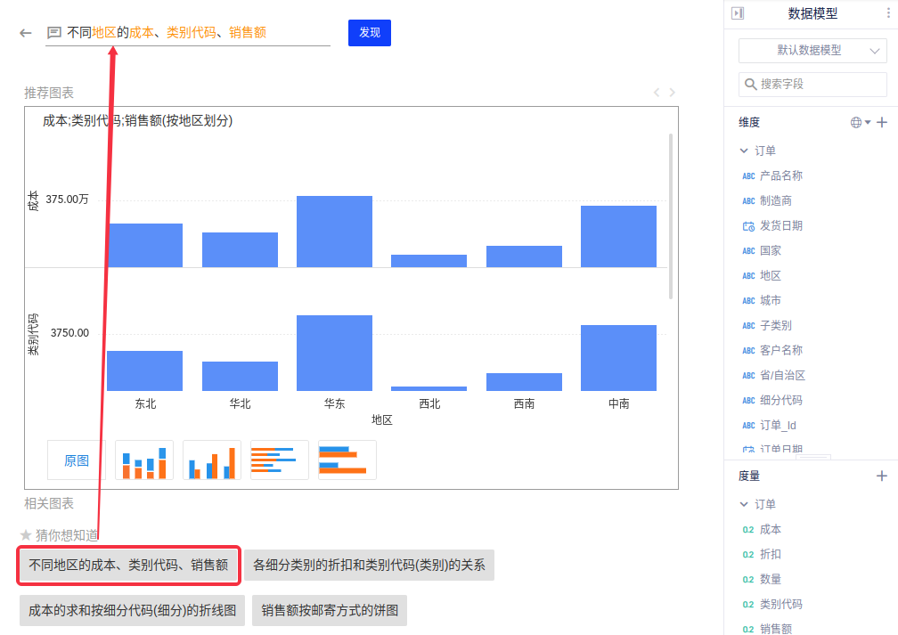 - 字段名称要和数据模型中的一致,系统不支持翻译功能。比如数据模型中有的字段是英文(Region和Sales),此时如果输入“每个地区的销售额”则无法显示,应该输入“每个Region的Sales”才能正常显示;