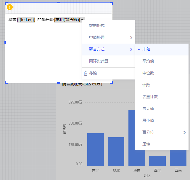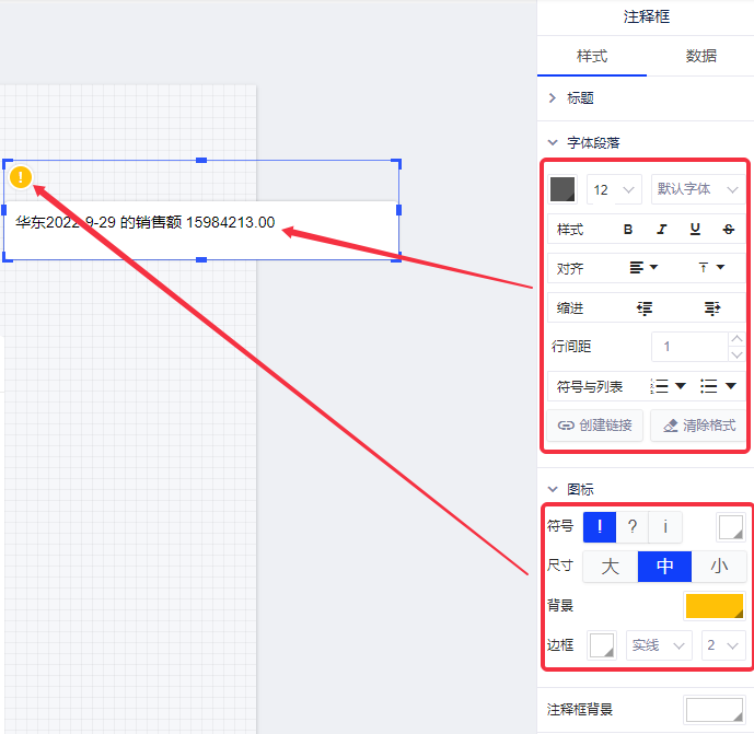1. 概述2. 快速入门1. 概述通过注释框控件,您可对某些特殊的点作批注,可将注释框添加在报告的任意位置,鼠标移动到控件上,即会浮窗显示提示信息。效果如下图所示: 本文为您介绍如何创建并设置注释框控件。 2. 快速入门(1)在画布上画出一个空白的注释框控件; (2)双击进入注释文本编辑页面,添加注释文字,输入#号可插入动态时间,输入* 号可插入度量,如下图所示; (3)支持修改符号形状颜色、背景颜色、边框颜色和注释框背景颜色,如下图所示。