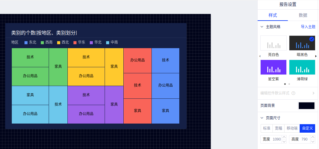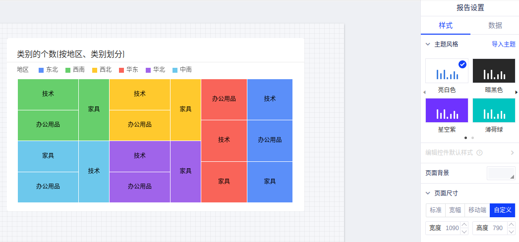 报告支持主题的配置,选择对应的主题后,可对报告上所有页面的图表统一配置配色、控件样式、图表样式、字体等,更好的作出美观好看的报告。