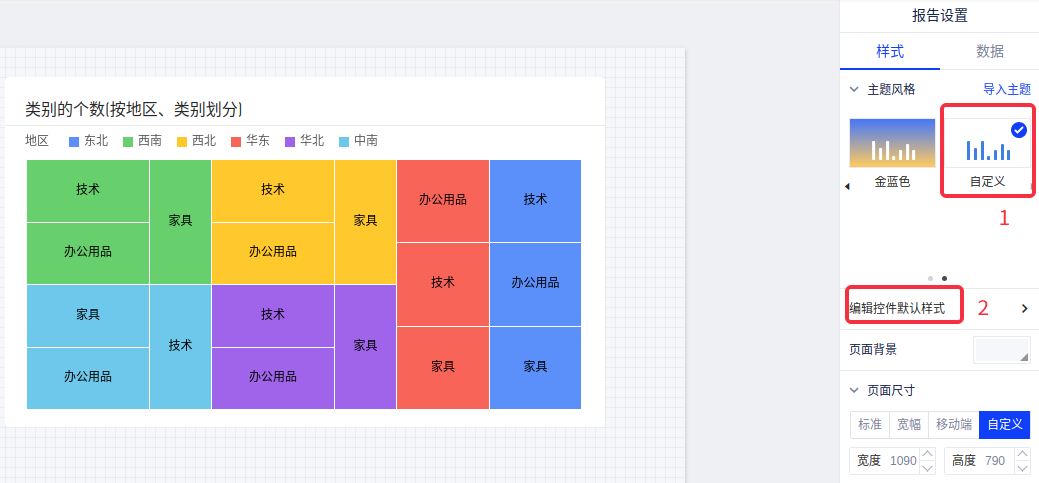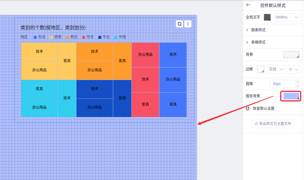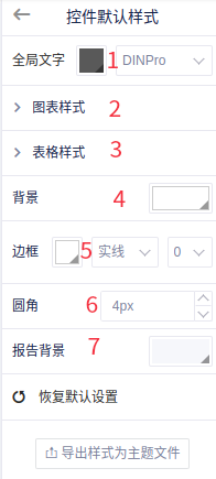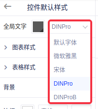 选择自定义主题并进入“控件默认样式”编辑页后,您可对全局文字、图表样式、表格样式、背景、边框、圆角、报告背景进行DIY。