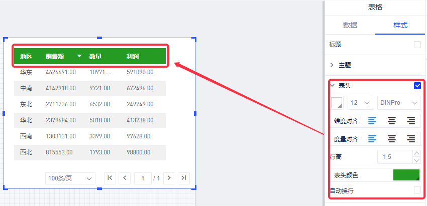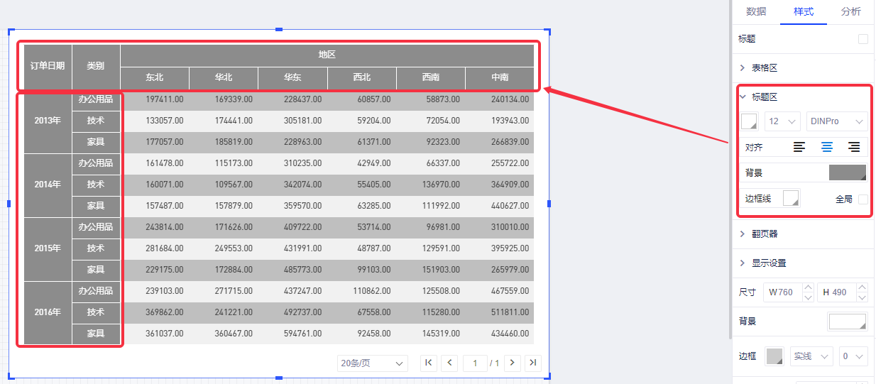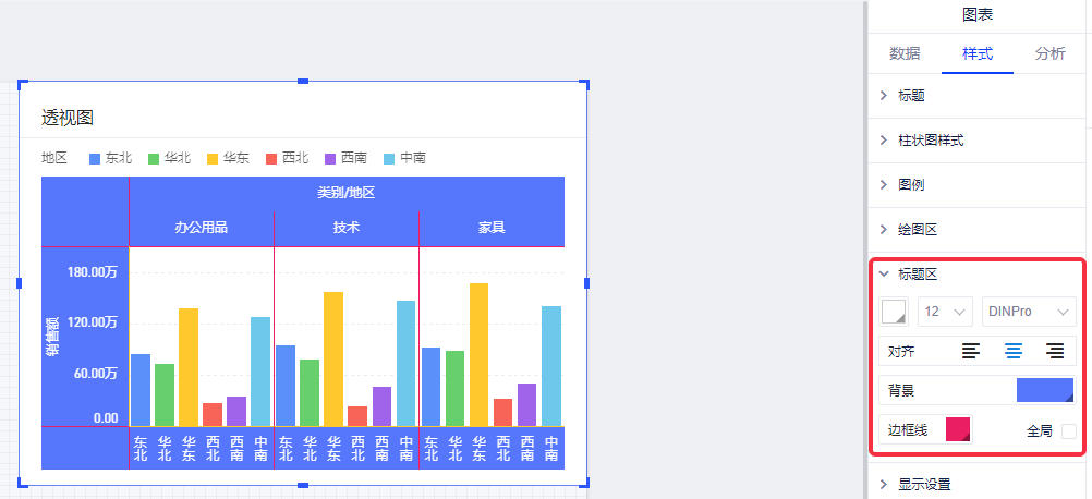 指表中红框内部分;可设置该区域文字的颜色、字号、字体、对齐方式;还可设置标题区内的背景颜色和边框颜色;