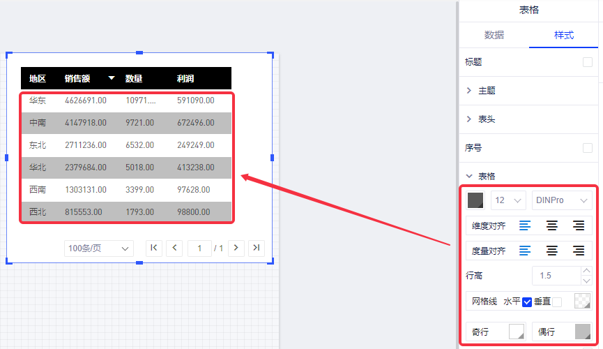 指图中红框内部分,可设置该区域的文字颜色、字号、字体对齐方式和网格线颜色,也可设置该区域的奇行颜色、偶行颜色;
