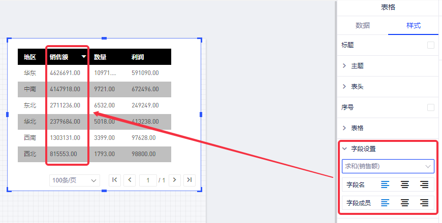 指图中红框内部分,根据字段名称设置该列字段名和字段成员的对齐方式。