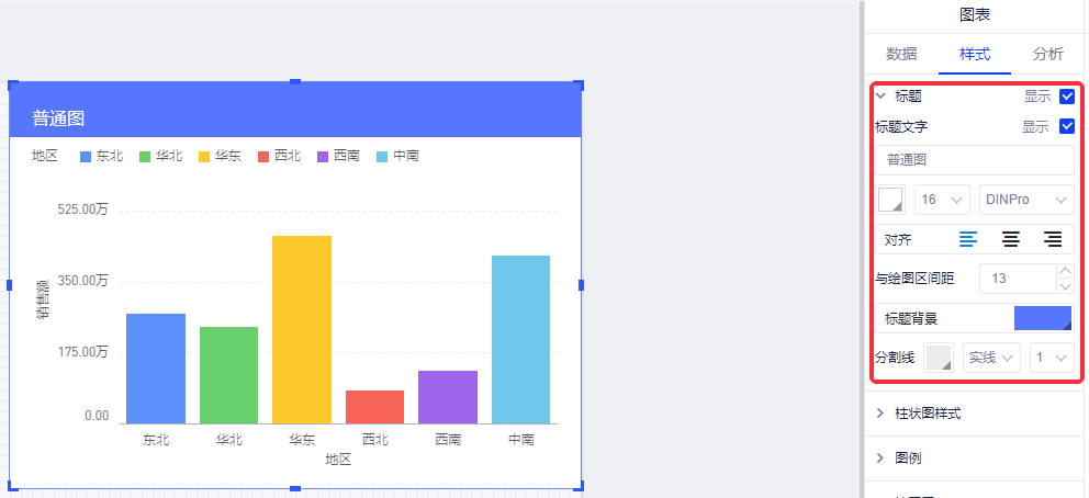 标题区:指图中蓝色区域部分,可设置该区域文字的颜色、字号、字体、对齐方式,还可设置标题区内的背景颜色和边框颜色;