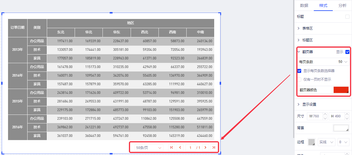 翻页器在数据较多的时候常被运用,可选择显示或者不显示,默认显示翻页器;可选择每页显示条数;