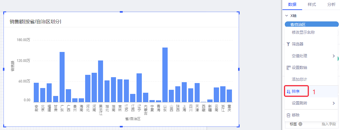 (1)在维度字段“省/自治区”下拉菜单中选择排序;
