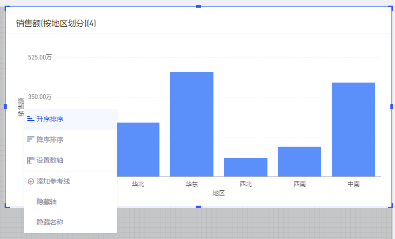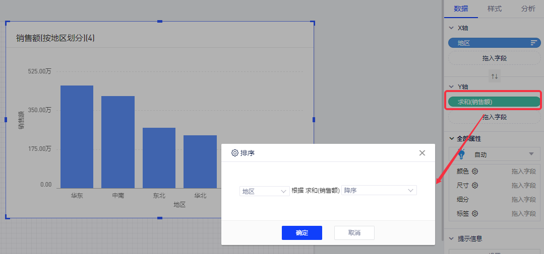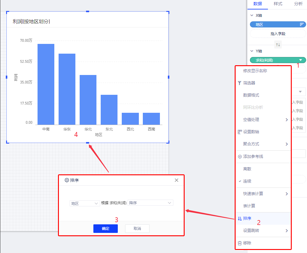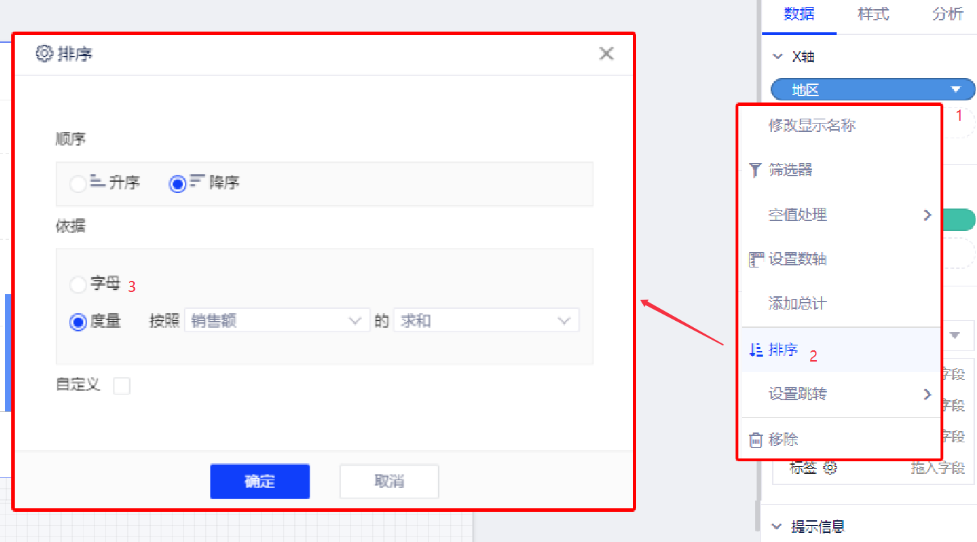 排序功能支持对图表的x轴、y轴及表格中的字段进行排序。排序方式有升序、降序及自定义排序三种方式。度量字段只支持升序和降序两种排列方式,其他字段可以自定义字段值的顺序。