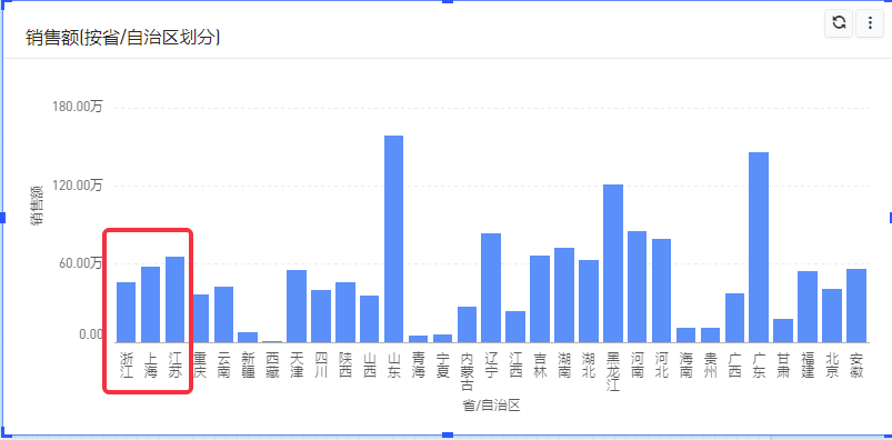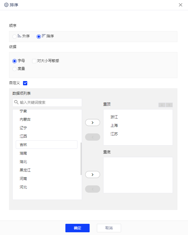 (2)在排序配置页面勾选“自定义”,然后将江浙沪省份置顶(若仅对部分数据设置了排序,预览报告时其他数据会按照原来设置的排序规则进行排列)。