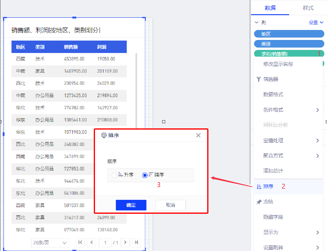 方法三:度量下拉菜单中选择排序,选择维度(地区)按照度量(销售额)的降序;