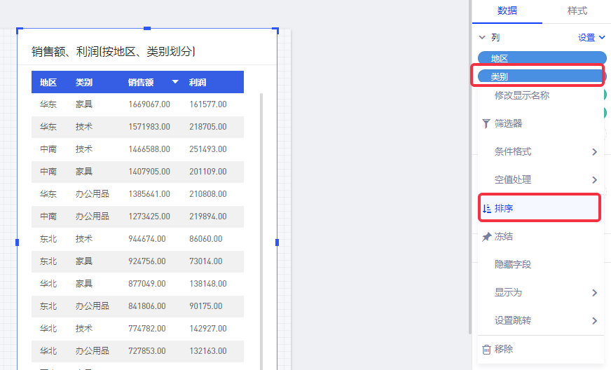 如果你还想对维度字段(产品类别)进行排序,则在产品类别字段的下拉菜单中选择排序;