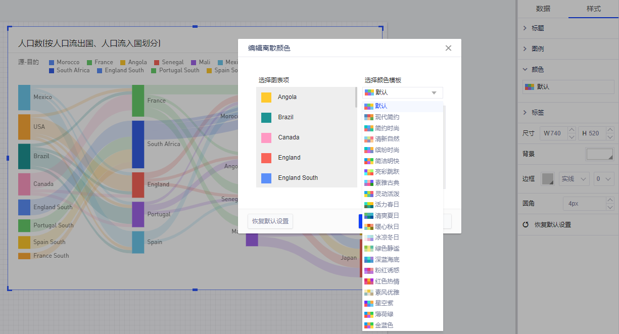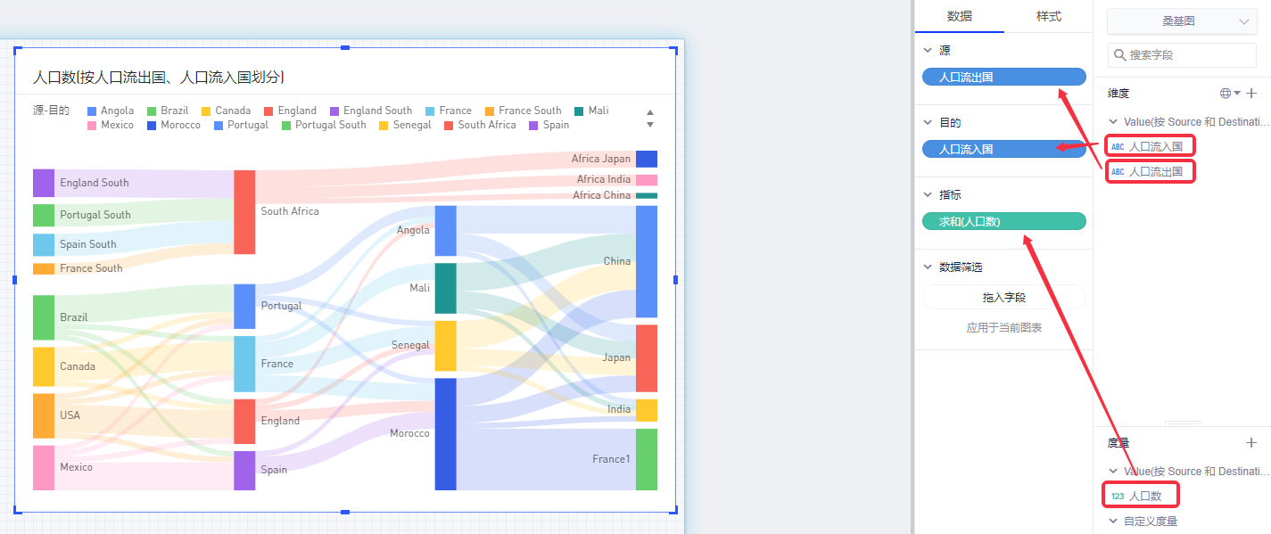(2)将维度“人口流出国”拖入源,“人口流入国”拖入目的,将度量“人口数”拖入指标,即得到一张初步的桑基图;