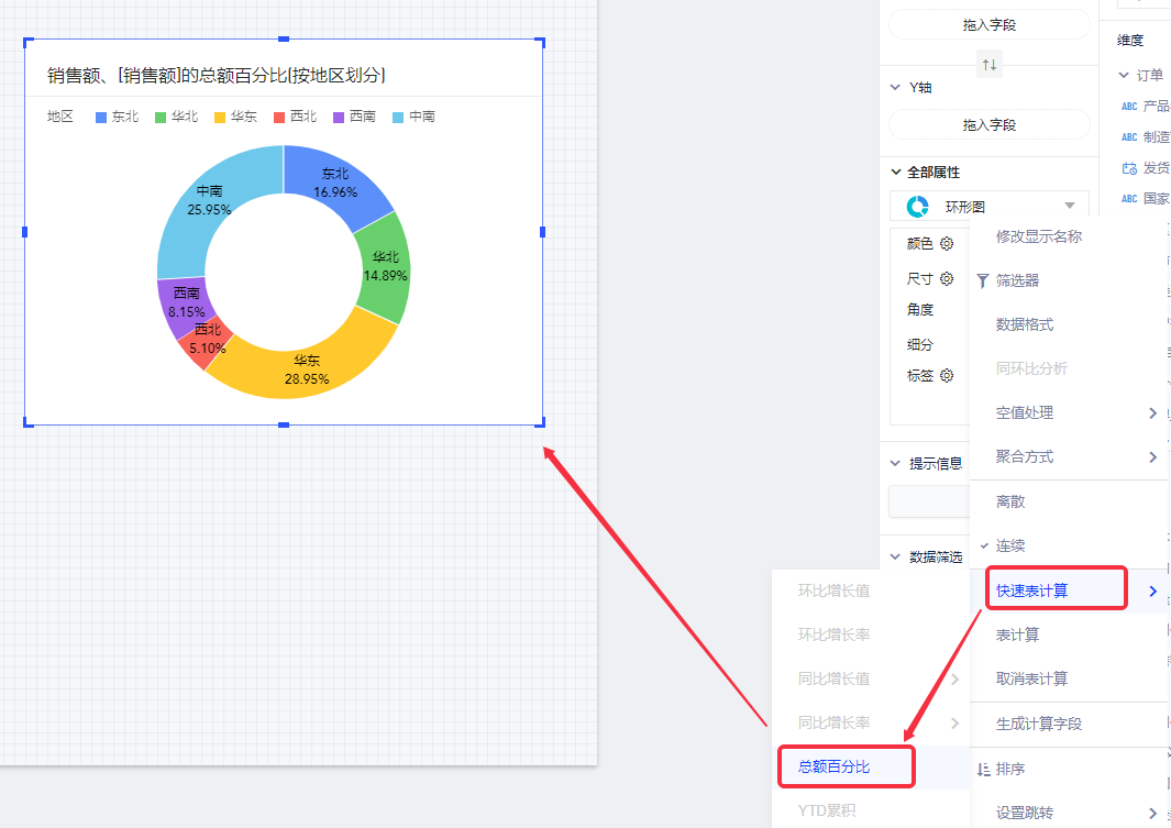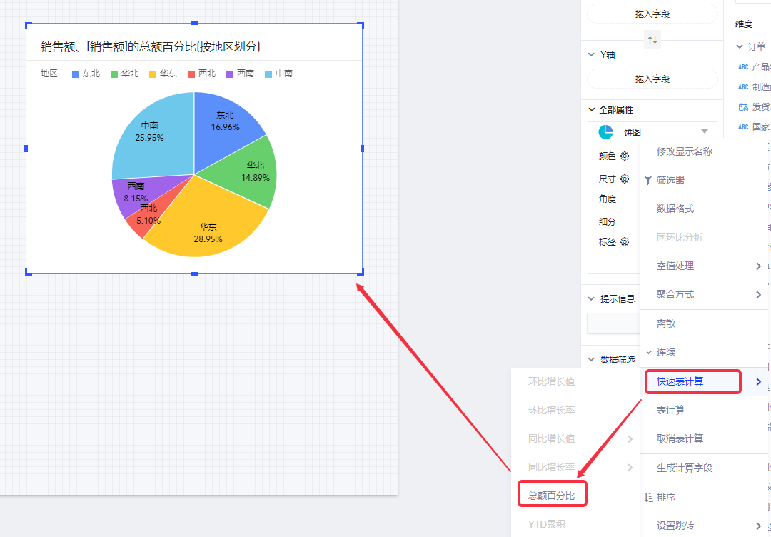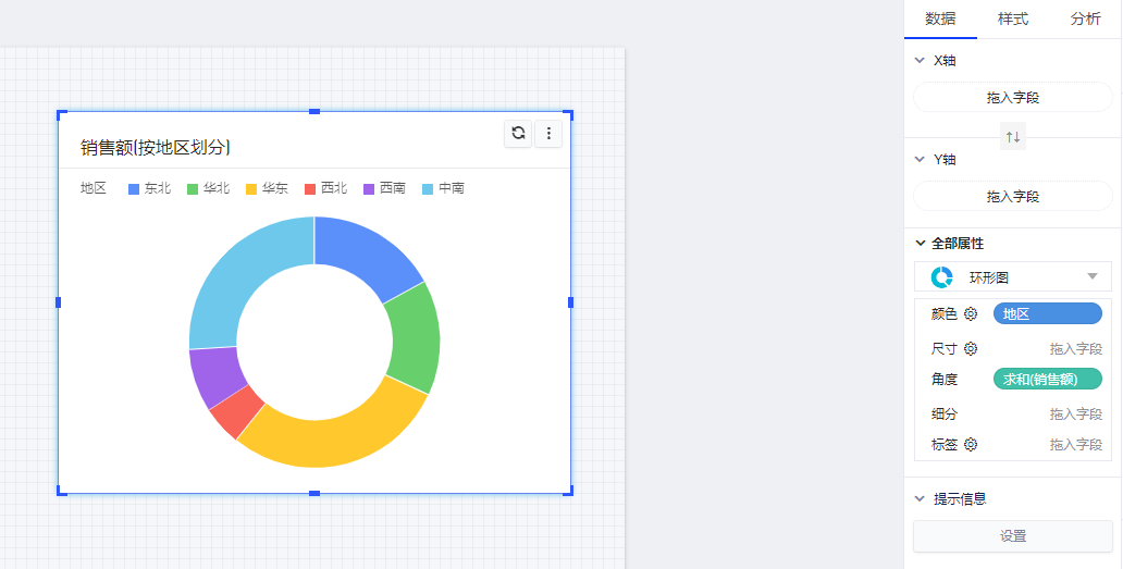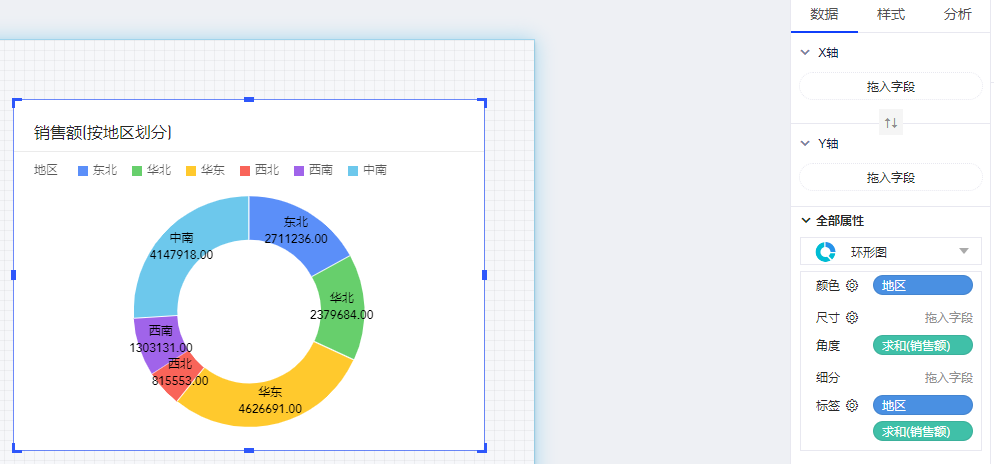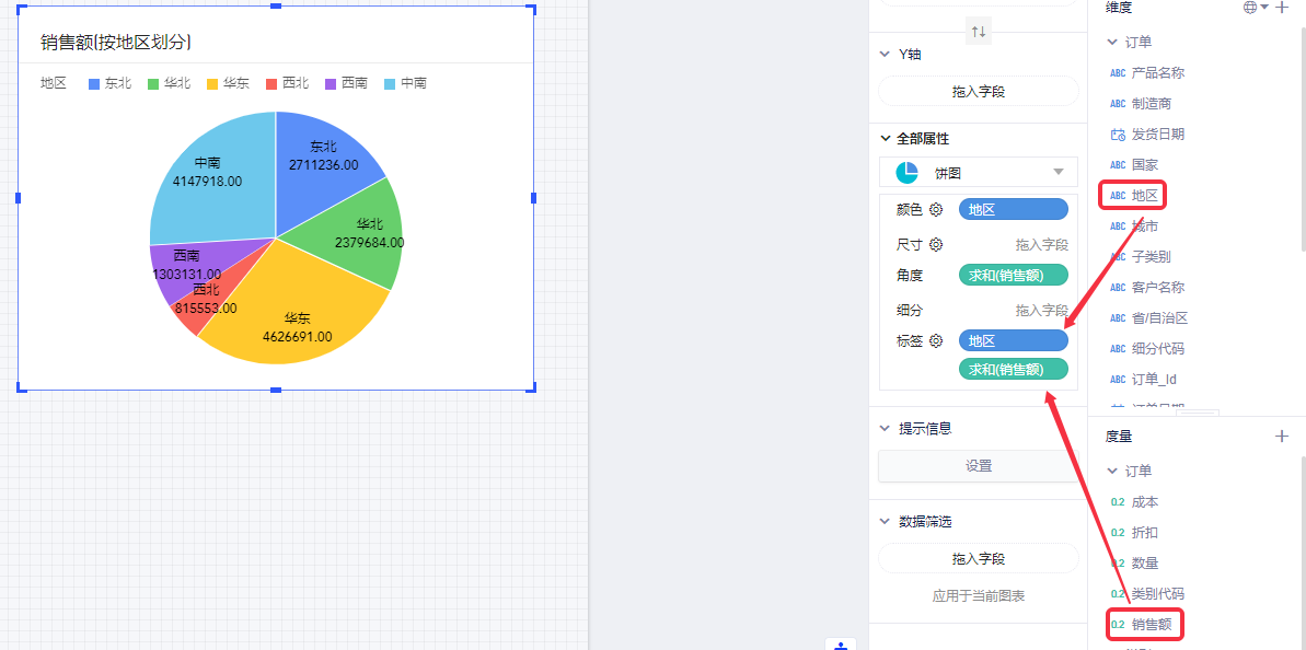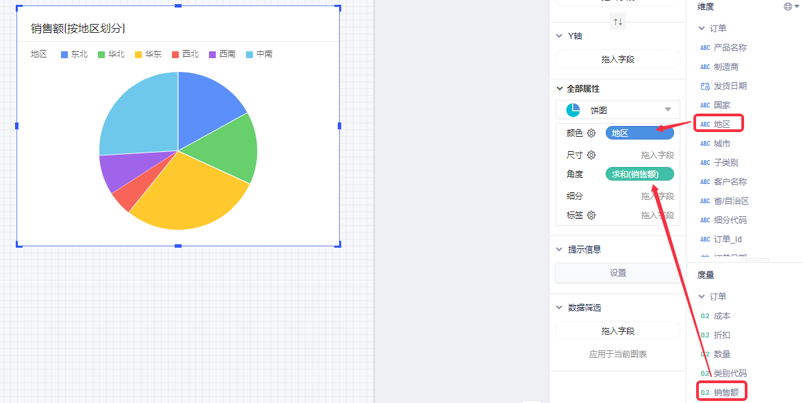 以默认数据模型为例,查看地区的销售额占比情况,将涉及到2个字段:维度“地区”,度量“销售额”。