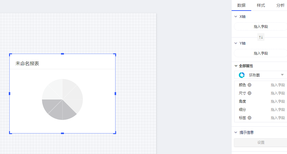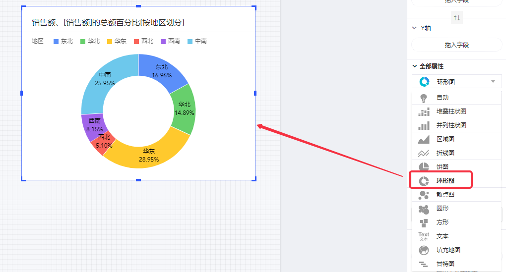 (2)在图表的数据面板的操作:在属性面板中选择图表类型为“环形图”;