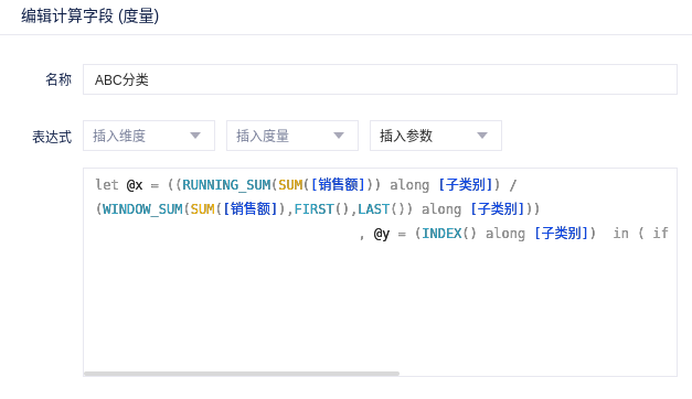 (1)新建计算字段,命名为“ABC分类”,输入下方表达式: