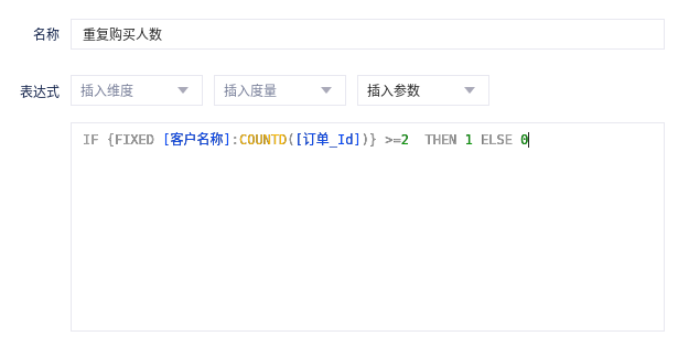 表达式:IF {FIXED [客户名称]:COUNTD([订单_Id])} >=2 THEN 1 ELSE 0