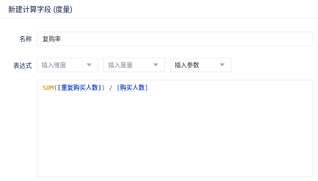 新建一个名称为“复购率”的计算字段,如下图所示: