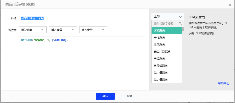 如果想查看“订单日期”前一个月的相关信息,可以在计算字段的输入框中输入:DATEADD("month",1, [订单日期])