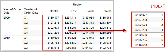 返回分区中当前行的索引,不包含与值有关的任何排序。第一个行索引从 1 开始。例如,下表显示每季度销售额。当在 Date 分区中计算 INDEX() 时,各行的索引分别为 1、2、3、4 等。