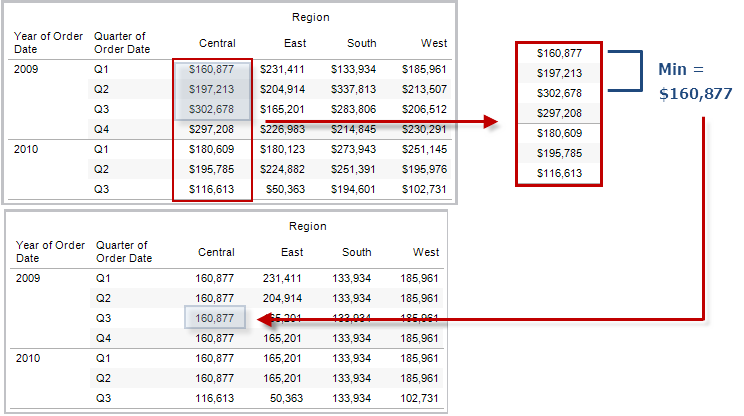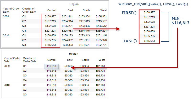 示例:WINDOW_MIN(SUM([Profit]), FIRST()+1, 0) along [Date],[Quarter]