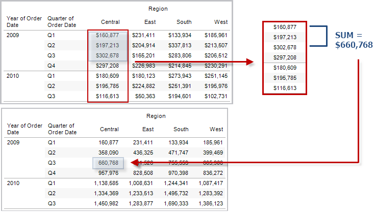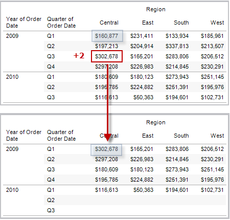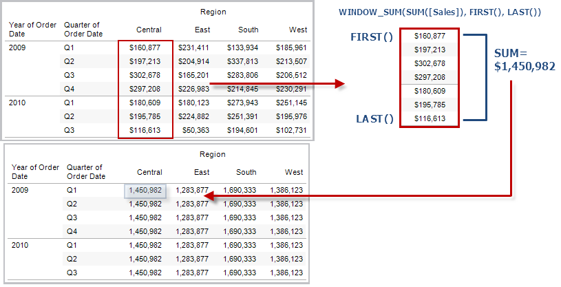 示例:WINDOW_SUM(SUM([Profit]), FIRST()+1, 0) along [Date],[Quarter]
