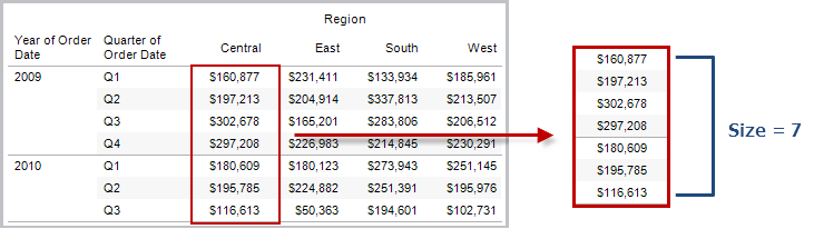 返回分区中的行数。例如,下面的视图显示每季度销售额。在 Date 分区中有七行,因此 Date 分区的 Size() 为 7。
