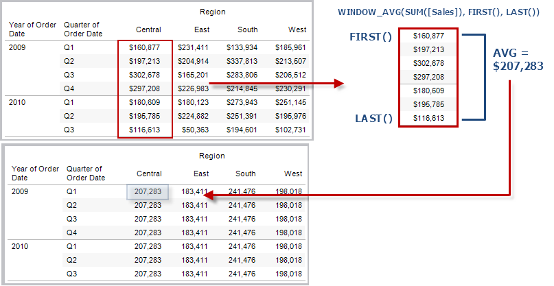 示例:WINDOW_AVG(SUM([Profit]), FIRST()+1, 0) along [Date],[Quarter]